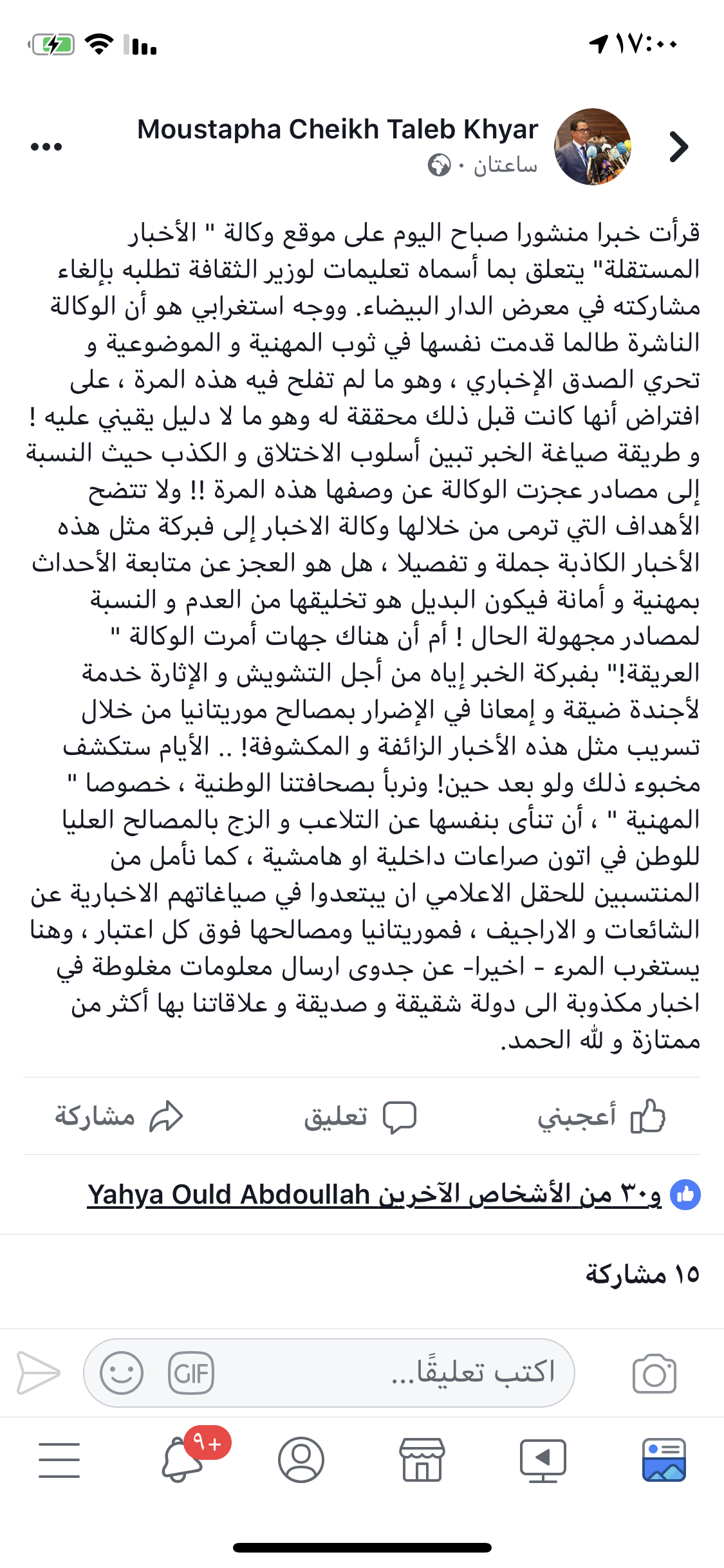 قرأت خبرا منشورا صباح اليوم على موقع وكالة ” الأخبار المستقلة” يتعلق بما أسماه تعليمات لوزير الثقافة تطلبه بإلغاء مشاركته في معرض الدار البيضاء. ووجه استغرابي هو أن الوكالة الناشرة طالما قدمت نفسها في ثوب المهنية و الموضوعية و تحري الصدق الإخباري ، وهو ما لم تفلح فيه هذه المرة ، على افتراض أنها كانت قبل ذلك محققة له وهو ما لا دليل يقيني عليه ! و طريقة صياغة الخبر تبين أسلوب الاختلاق و الكذب حيث النسبة إلى مصادر عجزت الوكالة عن وصفها هذه المرة !! ولا تتضح الأهداف التي ترمى من خلالها وكالة الاخبار إلى فبركة مثل هذه الأخبار الكاذبة جملة و تفصيلا ، هل هو العجز عن متابعة الأحداث بمهنية و أمانة فيكون البديل هو تخليقها من العدم و النسبة لمصادر مجهولة الحال ! أم أن هناك جهات أمرت الوكالة ” العريقة!” بفبركة الخبر إياه من أجل التشويش و الإثارة خدمة لأجندة ضيقة و إمعانا في الإضرار بمصالح موريتانيا من خلال تسريب مثل هذه الأخبار الزائفة و المكشوفة! .. الأيام ستكشف مخبوء ذلك ولو بعد حين! ونربأ بصحافتنا الوطنية ، خصوصا ” المهنية ” ، أن تنأى بنفسها عن التلاعب و الزج بالمصالح العليا للوطن في اتون صراعات داخلية او هامشية ، كما نأمل من المنتسبين للحقل الاعلامي ان يبتعدوا في صياغاتهم الاخبارية عن الشائعات و الاراجيف ، فموريتانيا ومصالحها فوق كل اعتبار ، وهنا يستغرب المرء – اخيرا- عن جدوى ارسال معلومات مغلوطة في اخبار مكذوبة الى دولة شقيقة و صديقة و علاقاتنا بها أكثر من ممتازة و لله الحمد