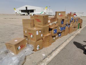 وتضم هذه الشحنة 20.000 جهاز فحص و 100.000 قناع و 1000 غطاء طبي للمساعدة في مكافحة انتشار وباء كورونا.