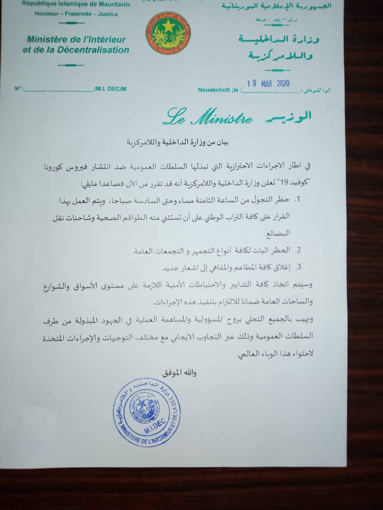 قررت وزارة الداخلية ولا مركزية في بيان لها اليوم الخميس حظر التجول إبتداء من الساعة الثامنة مساء وحتي السادسة فجرا علي امتداد التراب الوطني علي أن تستثني منه الطواقم الصحية وشاحنات نقل البضائع وذالك في إطار الإجراءات المتخذة ضد تفشي فيروس “كورونا” المستجدوتم حظر كافة أنواع التجمهر والتجمعات العامة ، كما تم إغلاق المطاعم والمقاهي إلى إشعار جديد.