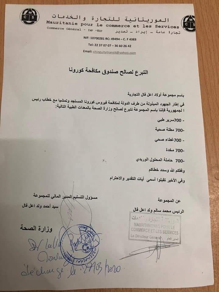 تبرعت مجموعة “أولاد أعل فال التجارية” لصالح وزارة الصحة بمعدات طبيبة وتجهيزات وآليات تناهز قيمتها مائة مليون أوقية، وذلك في إطار الجهود المبذولة لمكافحة فيروس كورونا المستجد.