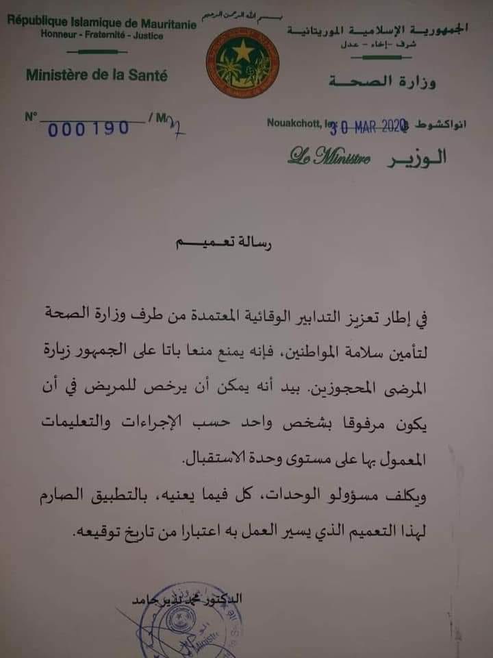 أصدرت وزارة الصحة الموريتانية  صباح اليوم تعميما بمنع زيارة المرضى المحجوزين في المستشفيات، ضمن إجراءات الوقاية من فيروس كورونا