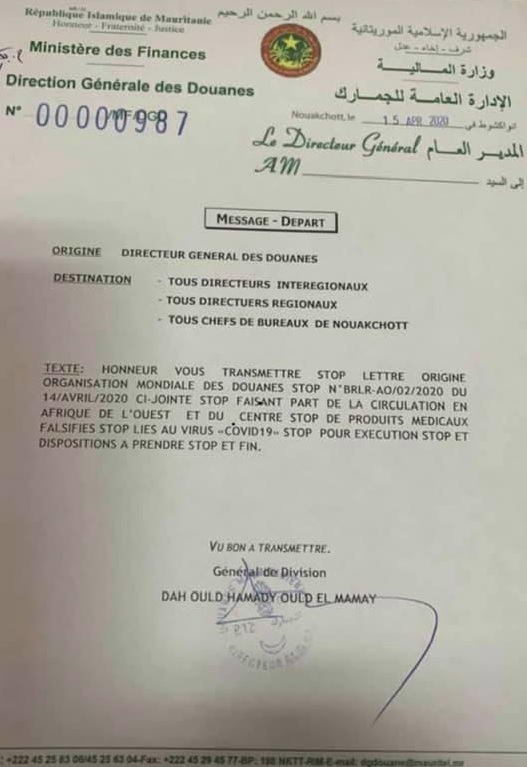 الإدارةالعامة للجمارك تصدر تعميما تحذر فيه من أدوية مزورة لعلاج “كورونا” (وثيقة) 17 أبريل, 2020 Print PDF eBook أصدرت الإدارة العامة للجمارك في موريتانيا صباح اليوم الجمعة 17 أبريل 2020، تعميما تحذر من خلاله كافة فرقها من أدوية مزورة لعلاج فيروس كورونا تم تداولها في القارة الافريقية. وأكد التعميم أنه صادر عن منظمة الجمارك الدولية. شاركها Facebook Twitter Stumbleupon LinkedIn Pinterest