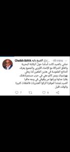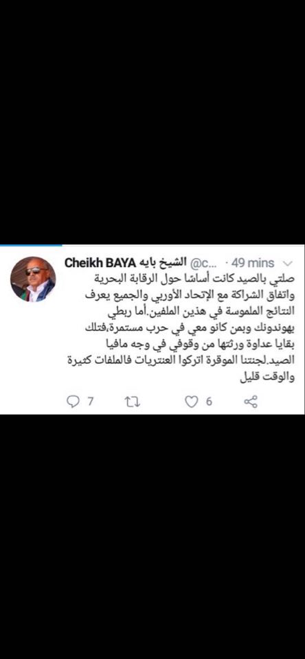 كتب رئيس الجمعية الوطنية الشيخ ولد بايه علي حسابه في تويتر أن صلته بقطاع الصيد “كانت أساسًا حول الرقابة البحرية واتفاق الشراكة مع الإتحاد الأوربي والجميع يعرف النتائج الملموسة في هذين الملفين”.