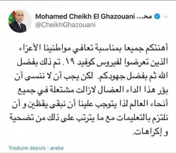 وفي تغريدة ثانية وجه الرئيس ولد الغزواني تعازيه ، لذوي المتوفين الموريتانيين بفيروس كورونا بالداخل والخارج كما تمنى الشفاء العاجل “للذين منهم مازالوا يخضعون للعلاج في الخارج”.