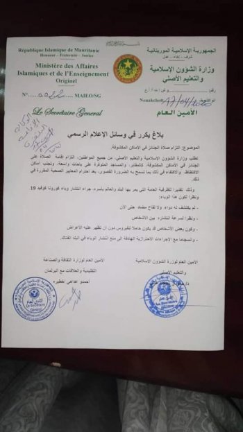 “تطلب وزارة الشؤون الإسلامية والتعليم الأصلي من جميع المواطنين، التزام إقامة الصلاة على الجنائز في الأماكن المكشوفة كالمقابر والمساجد المتوفرة على باحات واسعة، وتجنب أماكن الاكتظاظ والاكتفاء في ذلك بما تسمح به الضرورة القصوى، بعد احترام المعايير الصحية المقررة في ذلك .