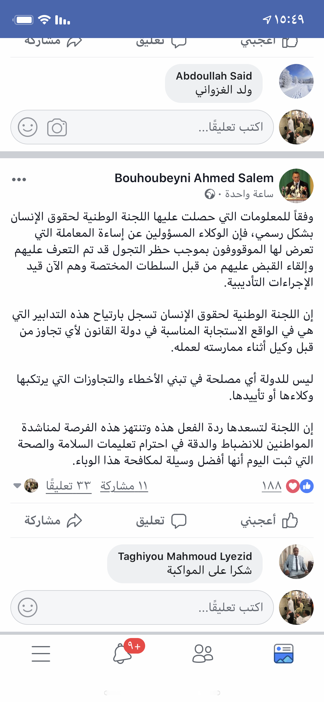 أعرب رئيس اللجنة الوطنية لحقوق الإنسان الأستاذ أحمد سالم ولد بوحيبيني عن ارتياحه  للشروع في الإجراءات التأديبية في حق عناصر الأمن المسؤولين عن إساءة معاملة لمواطنين بحجة خرقهم لحظر التجول.