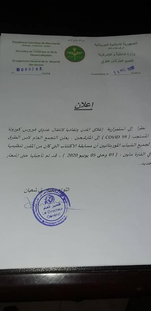 وجاء في مذكرة صادرة اليوم الأربعاء وقعها المدير العام اللواء المختار بل شعبان ، تلقت وكالة المرابع ميديا للإعلام والاتصال نسخة منها ” أنه نظرا لاستمرارية إغلاق المدن وتفاديا لانتقال عدوى فيروس كورونا المستجد إلى المترشحين ، يعلن التجمع العام لأمن الطرق لجميع الشباب الموريتانيين أن مسابقة الاكتتاب التي كان من المقرر تنظيمها في الفترة ما بين 1 وحتى 5 يونيو 2020، قد تم تأجيلها حتى إشعار جديد”.