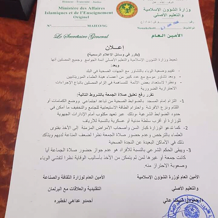 وأضافت الوزارة في بيان لها إنه، بعد تقييم وضعية الوباء بالتشاور مع الجهات الصحية في البلد، وبعد تشاور موسع مع عدد كبير من أعضاء هيئة العلماء الموريتانيين، ونظرا لاستعداد بعض الأئمة للمساهمة وإلزام المصلين باتباع الإجراءات الاحترازية الضرورية تقرر رفع تعليق صلاة الجمعة بالشروط التالية: