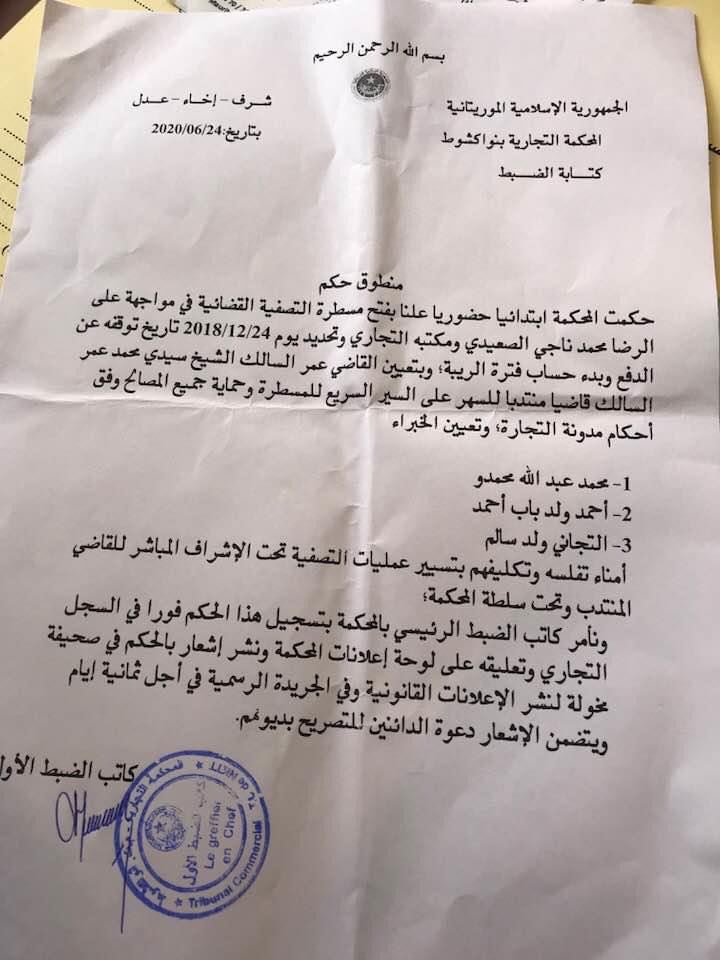 حكمت المحكمة التجارية بنواكشوط، بفتح مسطرة التصفية القضائية ضد المكتب التجاري للشيخ علي الرضا محمد ناجي الصعيدي.