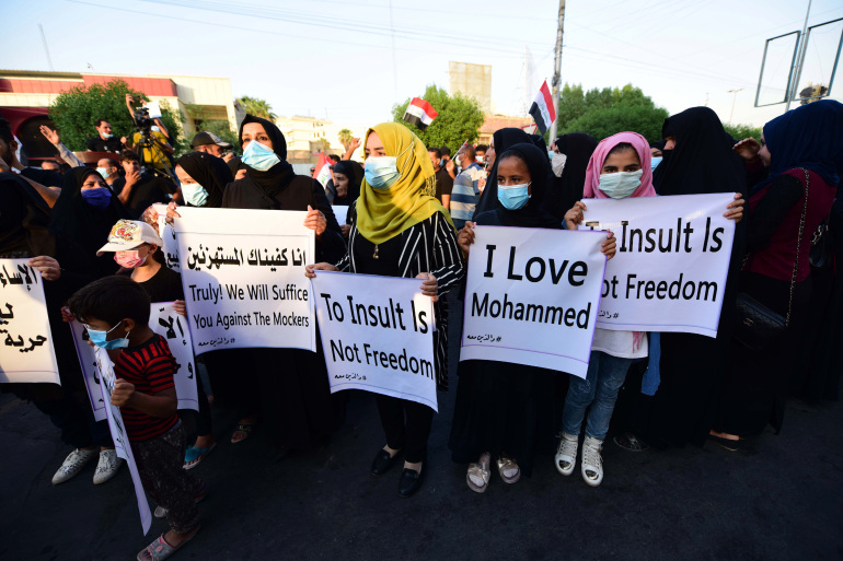 ورفع المتظاهرون لافتات تطالب بمقاطعة المنتجات الفرنسية ردا على الموقف الفرنسي.كما تظاهر مئات الفلسطينيين، في بلدة الرام (شمالي القدس)، للتنديد بتصريحات الرئيس الفرنسي إيمانويل ماكرون المسيئة للإسلام. إدانات رسميةوفي سياق ردود الفعل، أدانت 13 دولة عربية وإسلامية خطابات الكراهية والإساءة، التي أدلى بها الرئيس الفرنسي إيمانويل ماكرون، ضد الإسلام والمسلمين، والتي مست شخصية النبي محمد صلى الله عليه وسلم.