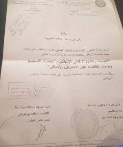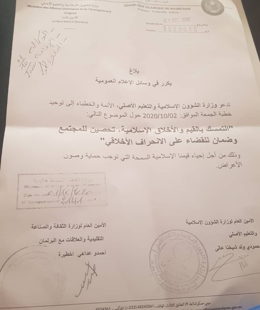 دعت وزارة الشؤون الإسلامية والتعليم الأصلي الأئمة والخطباء إلى توحيد خطبة الجمعة الموافق 02 – 10 – 2020، حول موضوع التمسك بالقيم والأخلاق الإسلامية تحصين للمجتمع وضمان للقضاء على الانحراف الأخلاقي.