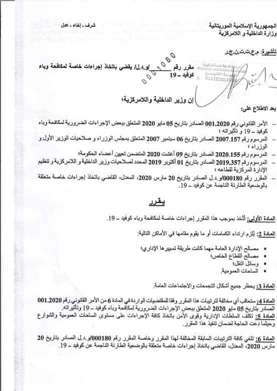 أصدر وزير الداخلية محمد سالم ولد مرزوك قرارا بمجموعة من الإجراءات الاحترازية لمواجهة تفشي موجة ثانية من كورونا.