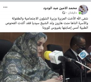 وكتب الصحفي محمد الأمين ولد عبد الودود تدوينة يدعو بالشفاء العاجل للوزيرة بعد إصابتها بفيروس كورونا