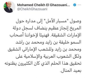 “وصول مسبار الأمل الى مداره حول المريخ إنجاز عظيم ينضاف لسجل دولة الإمارات الشقيقة فهنيئا لإخواننا أصحاب السمو خليفة بن زايد ومحمد بن راشد ومحمد بن زايد وللشعب الاماراتي الشقيق ولكل الشعوب العربية والإسلامية على تحقيق هذا الحلم الذى كان الكثيرون يظنونه بعيد المنال”
