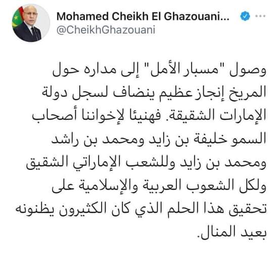 علق رئيس الجمهورية محمد ولد الشيخ الغزواني على صفحته في تويتر معبرا عن الإنجاز الكبير الذى حققته دولة الإمارات العربية المتحدة فى مجال الفضاء :