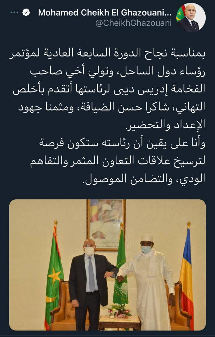 أشاد رئيس الجمهورية محمد ولد الشيخ الغزواني بالجهود التي بذلتها السلطات اتشادية للإعداد والتحضير للقمة السابعة لرؤساء مجموعة دول الساحل الخمس.