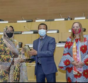 وقد استلمت الجائزة نيابة عن فخامة رئيس الجمهورية، سعادة السيدة خديجة أمبارك فال، سفيرة الجمهورية الإسلامية الموريتانية المعتمدة لدى أثيوبيا، ومندوبتها الدائمة لدى الاتحاد الإفريقي يوم الجمعة 26 فبراير 2021″.