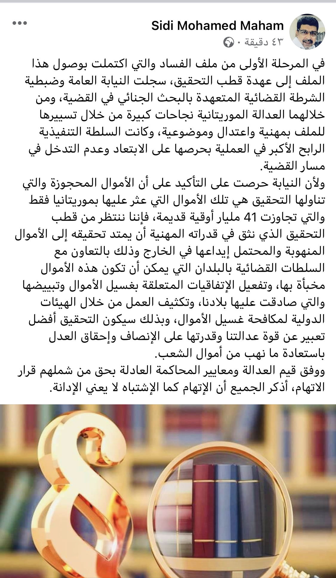 ولأن النيابة حرصت على التأكيد على أن الأموال المحجوزة والتي تناولها التحقيق هي تلك الأموال التي عثر عليها بموريتانيا فقط والتي تجاوزت 41 مليار أوقية قديمة، فإننا ننتظر من قطب التحقيق الذي نثق في قدراته المهنية أن يمتد تحقيقه إلى الأموال المنهوبة والمحتمل إيداعها في الخارج وذلك بالتعاون مع السلطات القضائية بالبلدان التي يمكن أن تكون هذه الأموال مخبأة بها، وتفعيل الإتفاقيات المتعلقة بغسيل الأموال وتبييضها والتي صادقت عليها بلادنا، وتكثيف العمل من خلال الهيئات الدولية لمكافحة غسيل الأموال، وبذلك سيكون التحقيق أفضل تعبير عن قوة عدالتنا وقدرتها على الإنصاف وإحقاق العدل باستعادة ما نهب من أموال الشعب.