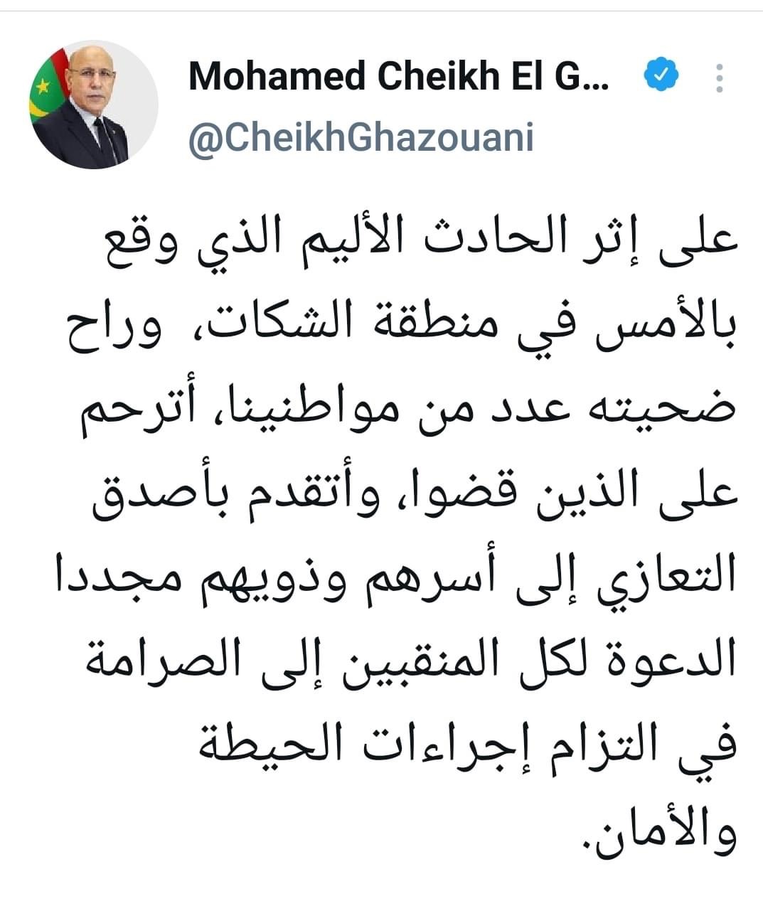 قدم رئيس الجمهورية السيد محمد ولد الشيخ الغزواني في تغريدة على حسابه الرسمي بتويتر