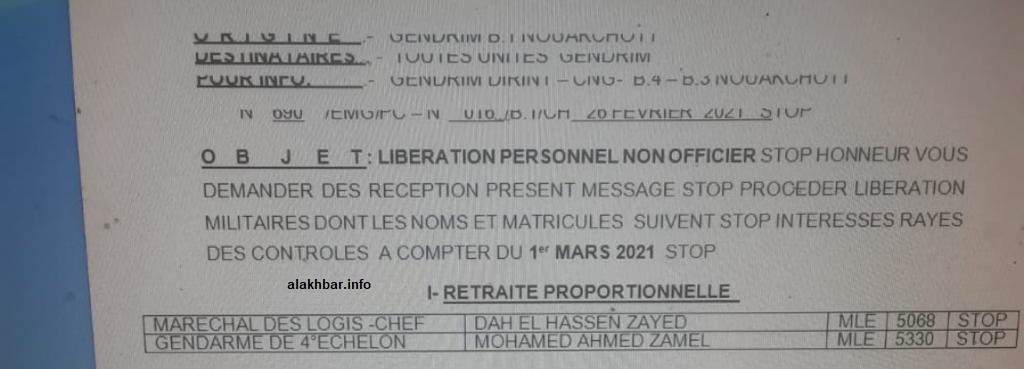 أصدر القائد العام لأركان الدرك الوطني  قرارا بفصل الضابطين الداه الحسن زايد، ومحمد أحمد الزامل من قطاع الدرك.
