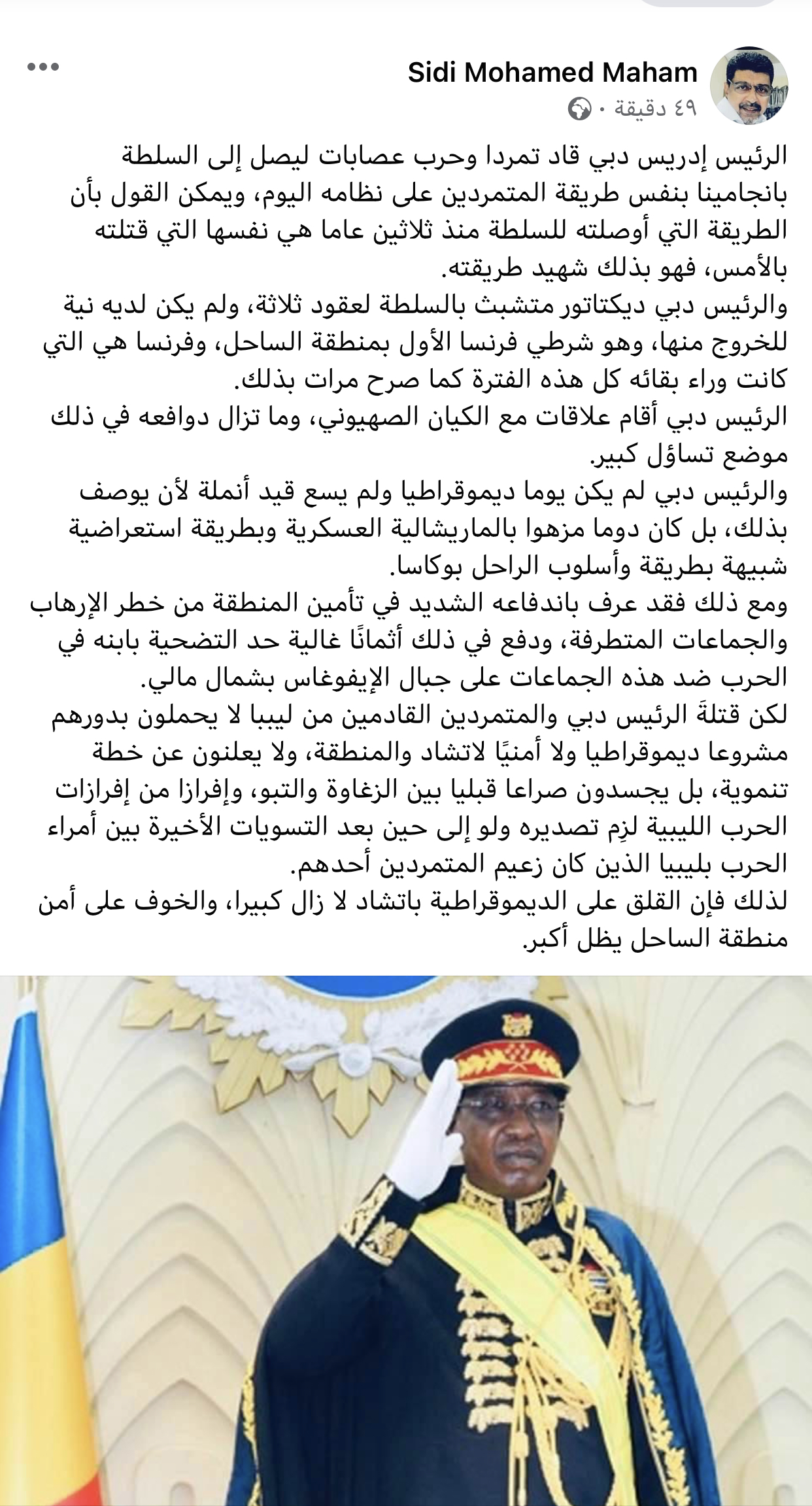 والرئيس دبي ديكتاتور متشبث بالسلطة لعقود ثلاثة، ولم يكن لديه نية للخروج منها، وهو شرطي فرنسا الأول بمنطقة الساحل، وفرنسا هي التي كانت وراء بقائه كل هذه الفترة كما صرح مرات بذلك.