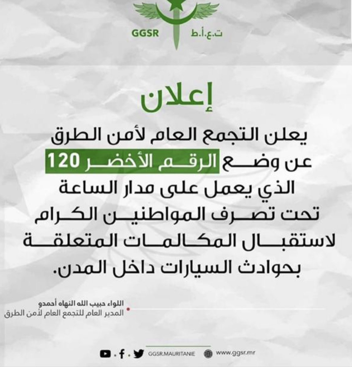 يعلن التجمع العام لأمن الطرق وضع الرقم 120 الذي يعمل علي مدار الساعة تحت تصرف المواطنين لاستقبال المكالمات المتعلقة بحوادث السيارات داخل المدن.