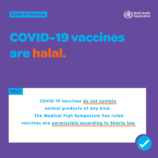 قالت منظمة الصحة العالمية إن اللقاحات المضادة لفيروس كورونا حلال، ولا تحتوي على أي مكون حيواني من أي نوع كان.