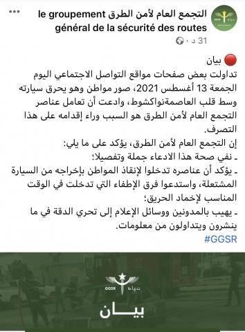 تداولت بعض صفحات مواقع التواصل الاجتماعي اليوم الجمعة 13 أغسطس 2021، صور مواطن وهو يحرق سيارته وسط قلب العاصمة انواكشوط ، وادعت أن تعامل عناصر التجمع العام لأمن الطرق هو السبب وراء إقدامه على هذا التصرف.