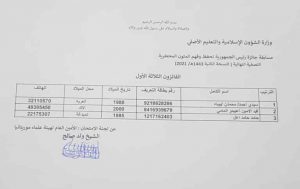 أعلنت وزارة الشؤون الإسلامية والتعليم الأصلي نتائج التصفية النهائية لمسابقة رئيس الجمهورية لحفظ وفهم المتون المحظرية (النسخة الثانية) 1443/2021).