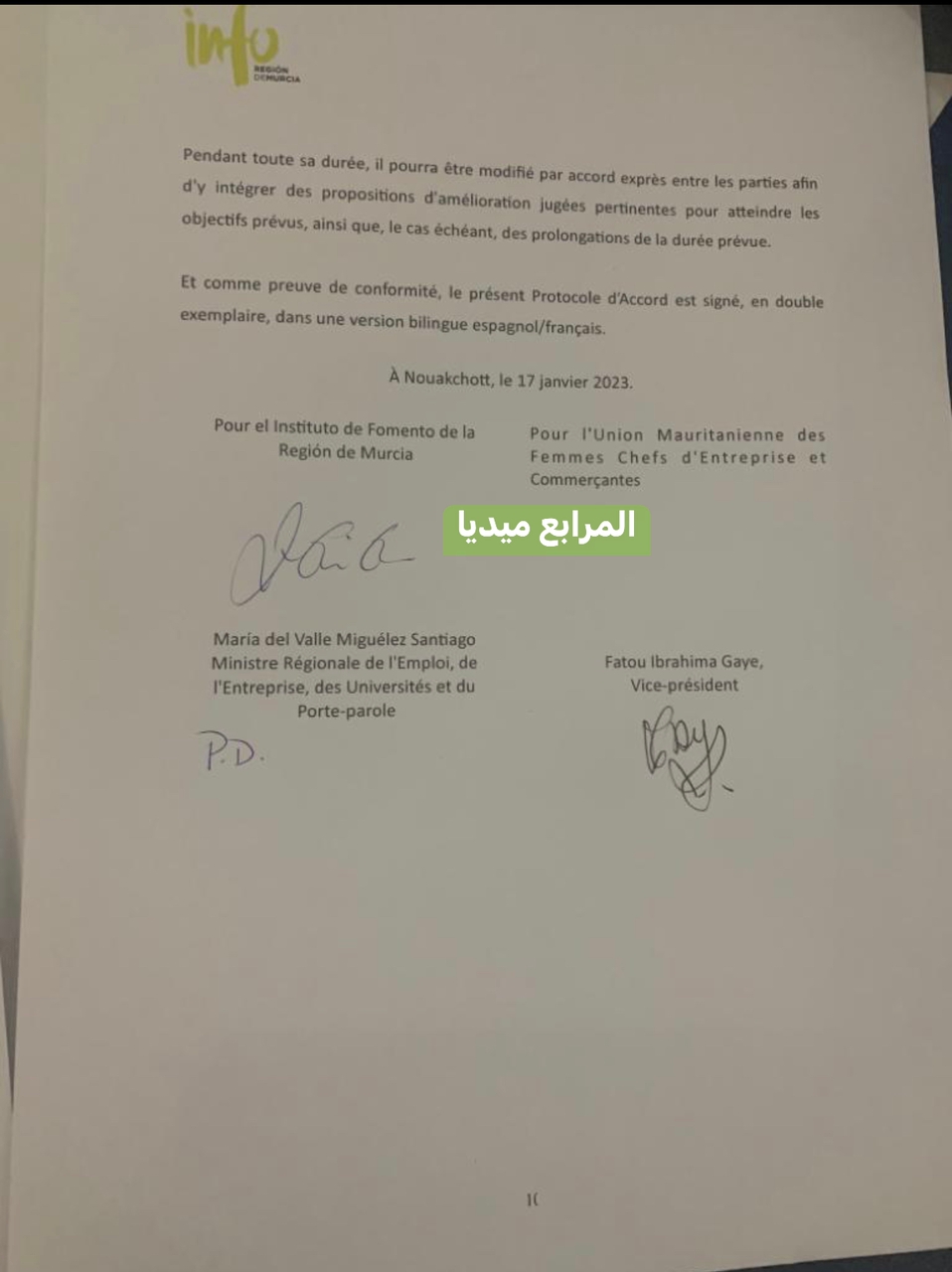 وحضر توقيع الاتفاقية وفد من الاتحاد الموريتاتي للنساء المقاولات والتاجرات يضم كل من: أم كلثوم بنت أحمد، والسالكة بنت سعيد ولد همدي، وجميلة عبد الله حماد، ومدينا إنيانغ. ويقوم فد رجال الأعمال الإسبان برئاسة الوزيرة المكلفة بالاقتصاد في ولاية مرسيه الإسبانية، ماريا ديلافييل، يقوم هذه الأيام بزيارة لموريتانيا حيث من المبرمج أن يجري الوفد لقاءات مع عدد من المسؤولين الموريتانيين.