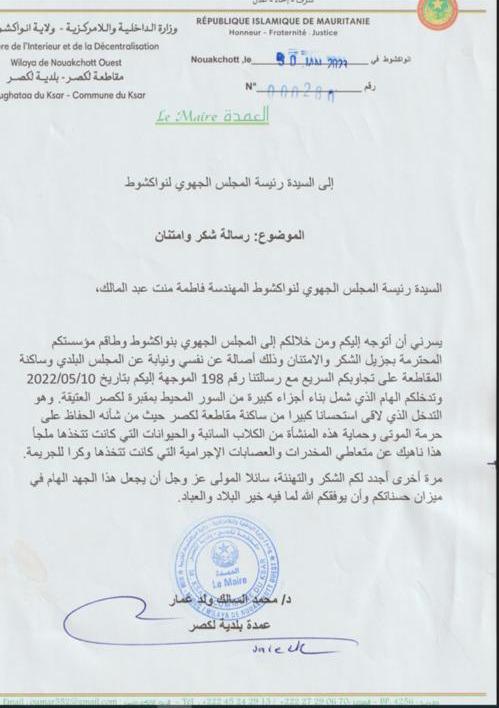 رسالة شكر وامتنان من بلدية لكصر لرئيسة المجلس الجهوي بنواكشوط