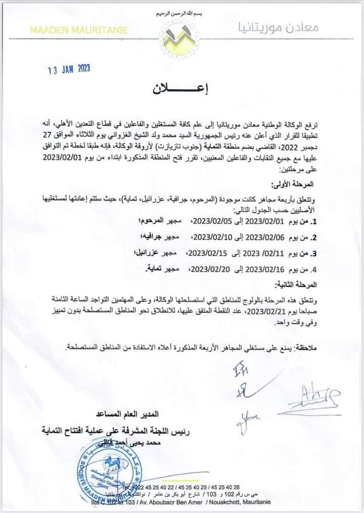أشعرت الوكالة الوطنية معادن موريتانيا المستغلين والفاعلين في قطاع التعدين الأهلي، أنه تطبيقا للقرار الذي أعلن عنه فخامة رئيس الجمهورية، السيد محمد ولد الشيخ الغزواني، يوم الثلاثاء الموافق 27 دجمبر 2022، القاضي بضم منطقة التماية(جنوب تازيازت) لأروقة الوكالة، فإنه طبقا لخطة تم الاتفاق عليها مع جميع النقابات والفاعلين المعنيين، تقرر فتح المنطقة المذكورة ابتداء من فاتح فبراير المقبل.