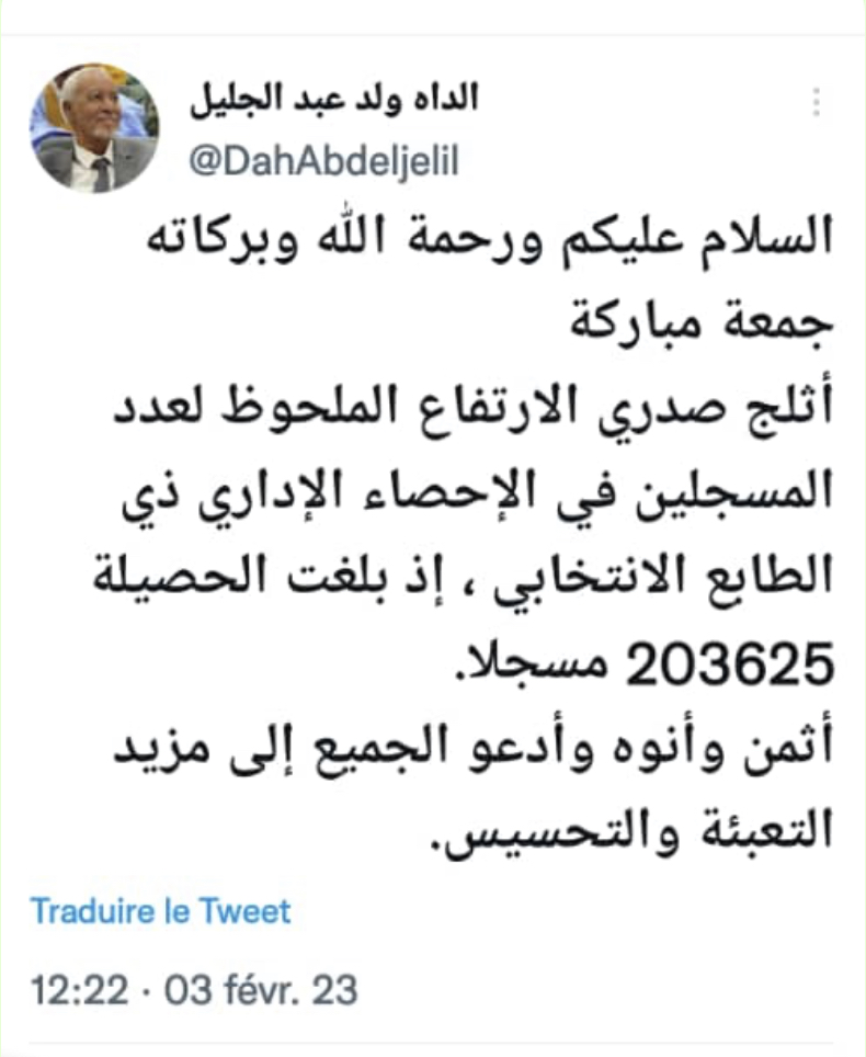ودوّن رئيس اللجنة الداه ولد عبد الجليل في صفحته على الفيس بوك قائلا: أثلج صدري الأرتفاع الملحوظ في أعداد المسجلين في الإحصاء الإداري ذي الطابع الانتخابي، إذ بلغت الحصيلة 203625 مسجلا.