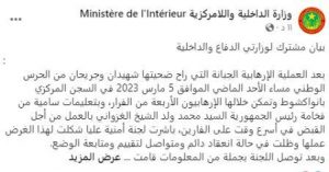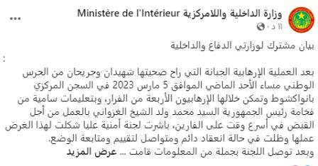 بعد العملية الإرهابية الجبانة التي راح ضحيتها شهيدان وجريحان من الحرس الوطني مساء الأحد الماضي الموافق 5 مارس 2023 في السجن المركزي بانواكشوط وتمكن خلالها الإرهابيون الأربعة من الفرار، وبتعليمات سامية من فخامة رئيس الجمهورية السيد محمد ولد الشيخ الغزواني بالعمل من أجل القبض في أسرع وقت على الفارين، باشرت لجنة أمنية عليا شكلت لهذا الغرض عملها وظلت في حالة انعقاد دائم ومتواصل لتقييم ومتابعة الوضع.