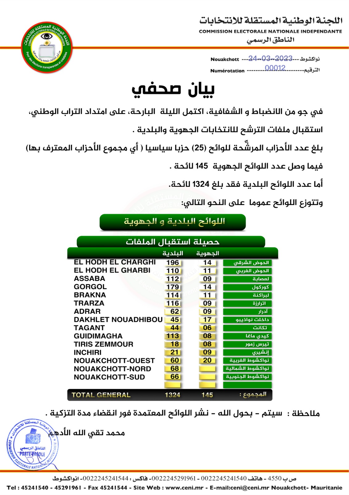 أعلنت اللجنة المستقلة للإنتخابات انتهاء الفترة القانونية لإيداع لوائح الترشح للانتخابات البلدية المقبلة وذلك على تمام الساعة 00 من مساء الخميس ال23 مارس 2023.