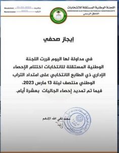 جاء ذلك بعد قرار اللجنة فى مداولاتها اختتام الإحصاء الإداري ذي الطابع الانتخابية ليلة  13 مارس 2023