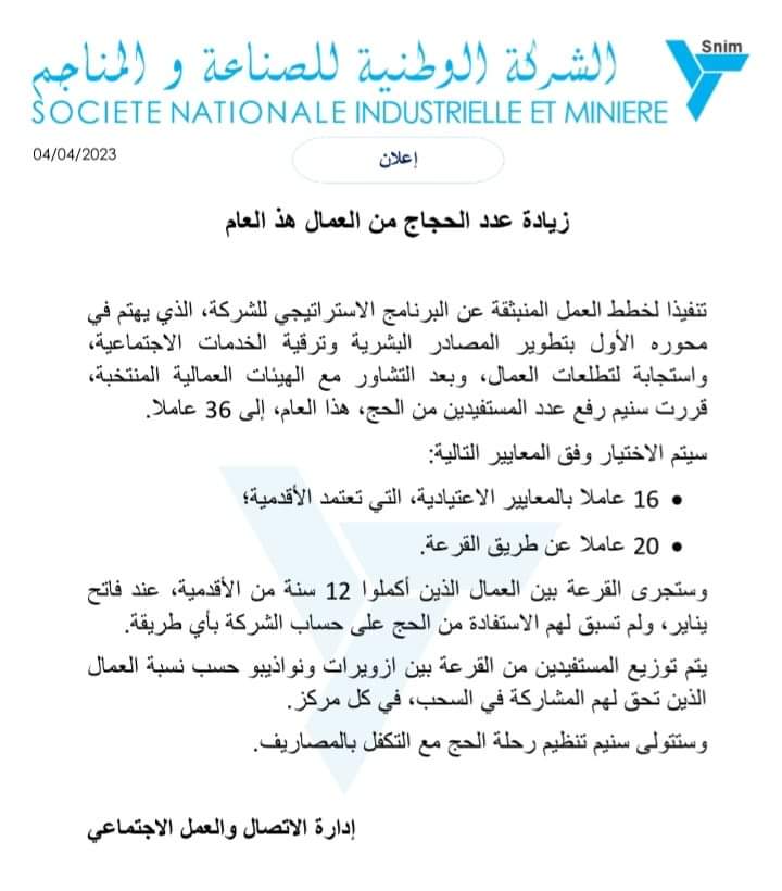 قررت الشركة الوطنية للصناعة والمناجم SNIM رفع عدد المستفيدين من الحج لموسم العام الجاري إلى 36 عاملا، حيث ستتولى الشركة «تنظيم رحلة الحج مع التكفل بالمصاريف».
