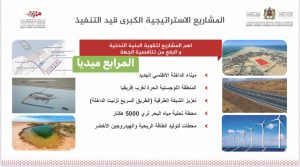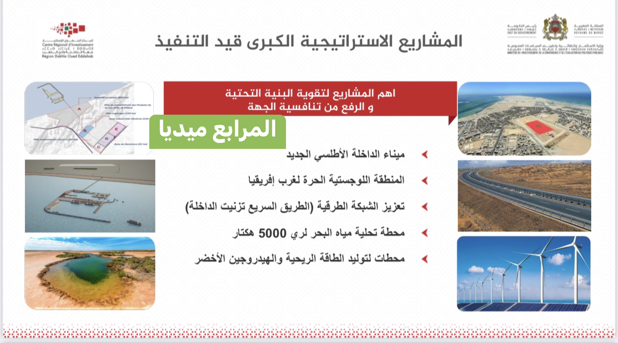 تعزيز الشبكة الطرقية (الطريق السريع تزنيت – الداخلة)، بالإضافة إلى محطة تحلية مياه البحر لري 5000 هكتار إلى جانب محطات لتوليد الطاقة الريحية والهيدروجين الأخضر.