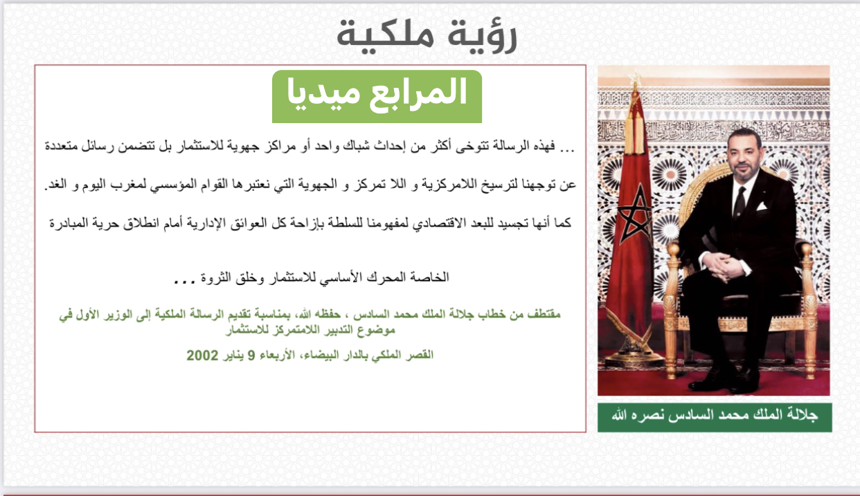 “فهذه الرسالة تتوخى أكثر من إحداث شباك واحد أو مراكز جهوية للاستثمار بل تتضمن رسائل متعددة عن توجهنا لترسيخ اللامركزية واللا تمركز والجهوية التي نعتبرها القوام المؤسسي لمغرب اليوم و الغد.