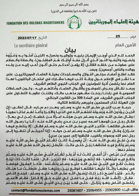 طالبت هيئة العلماء المورتيتانيين بقتل صاحب(ة) ورقة امتحان الباكلوريا المسيئة للجناب النبوي «إن ثبتت نسبتها إليه»، داعية إلى الابتعاد عن التظاهر والحشد».