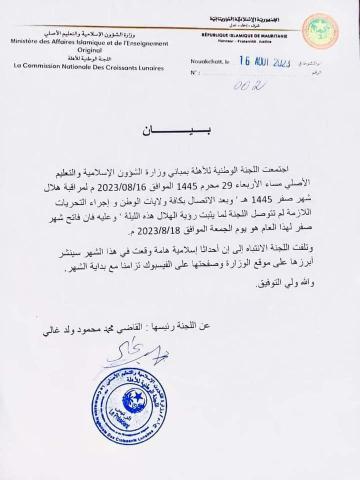 اللجنة المركزية لمراقبة الأهلة تعلن غدا فاتح شهر صفر للعام ١٤٤٥ هجري 17 أغسطس, 2023 Print PDF eBook أعلنت اللجنة المركزية لمراقبة الأهلة أن يوم غد الجمعة سيكون فاتح شهر صفر 1445للهجرة جاء ذلك في البيان التالي الذي وقعه رئيسها القاضي/محمدمحمود ولد محمد صالح شاركها Facebook Twitter Stumbleupon LinkedIn Pinterest