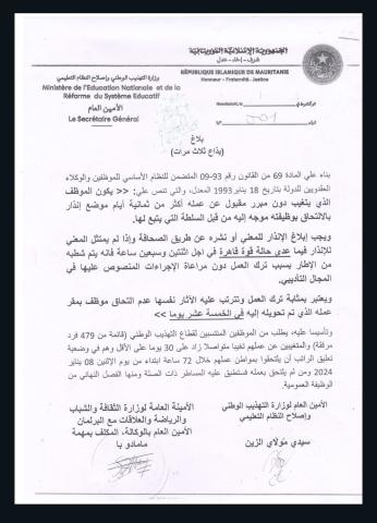 وجهت وزارة التهذيب الوطني وإصلاح النظام التعليمي اليوم الجمعة إنذارا لـ479 مدرسا بسبب تغيبهم عن عملهم طيلة 30 يومَ عمل متواصلة.