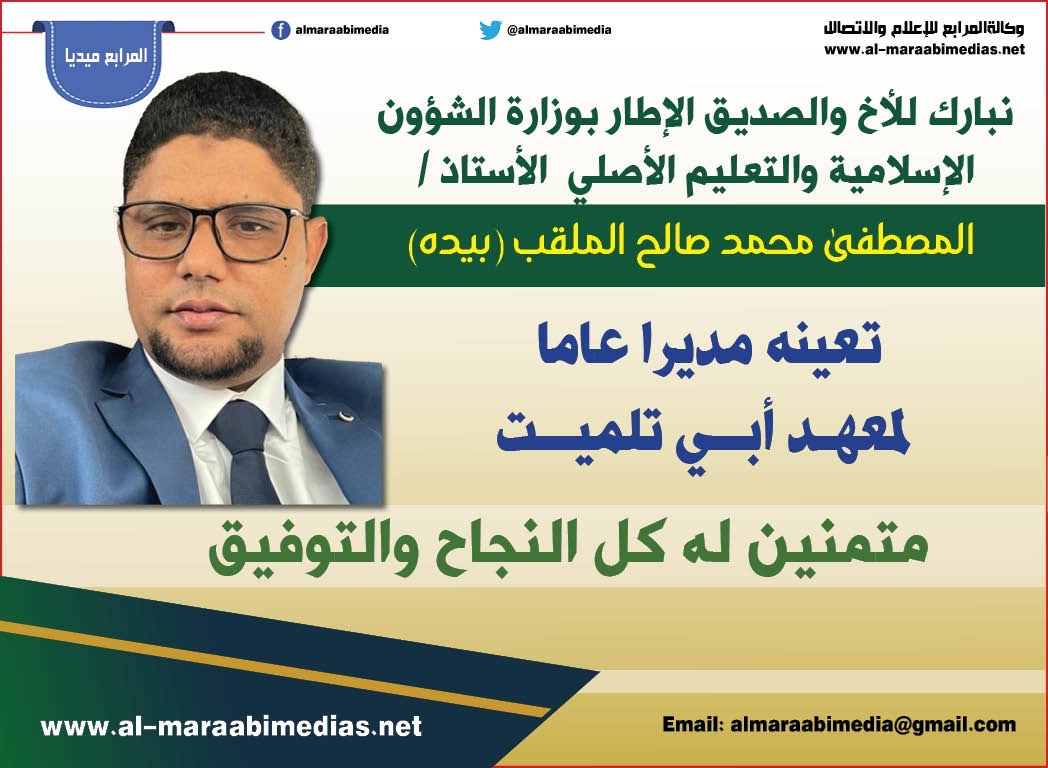 وقع وزير الشؤون الإسلامية والتعليم الأصلي الداه سيدي أعمر طالب اليوم الاثنين مذكرة عمل تم بموجبها تعيين الشاب الإطار المصطفي محمد صالح، مديرا لمعهد التعليم الأصلي في أبي تلميت،