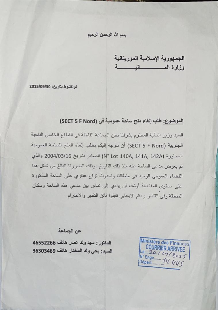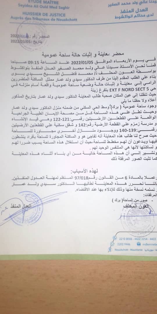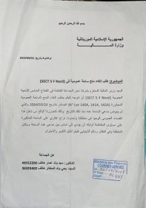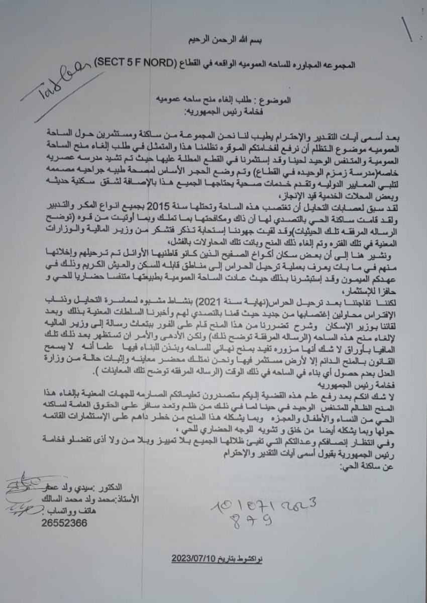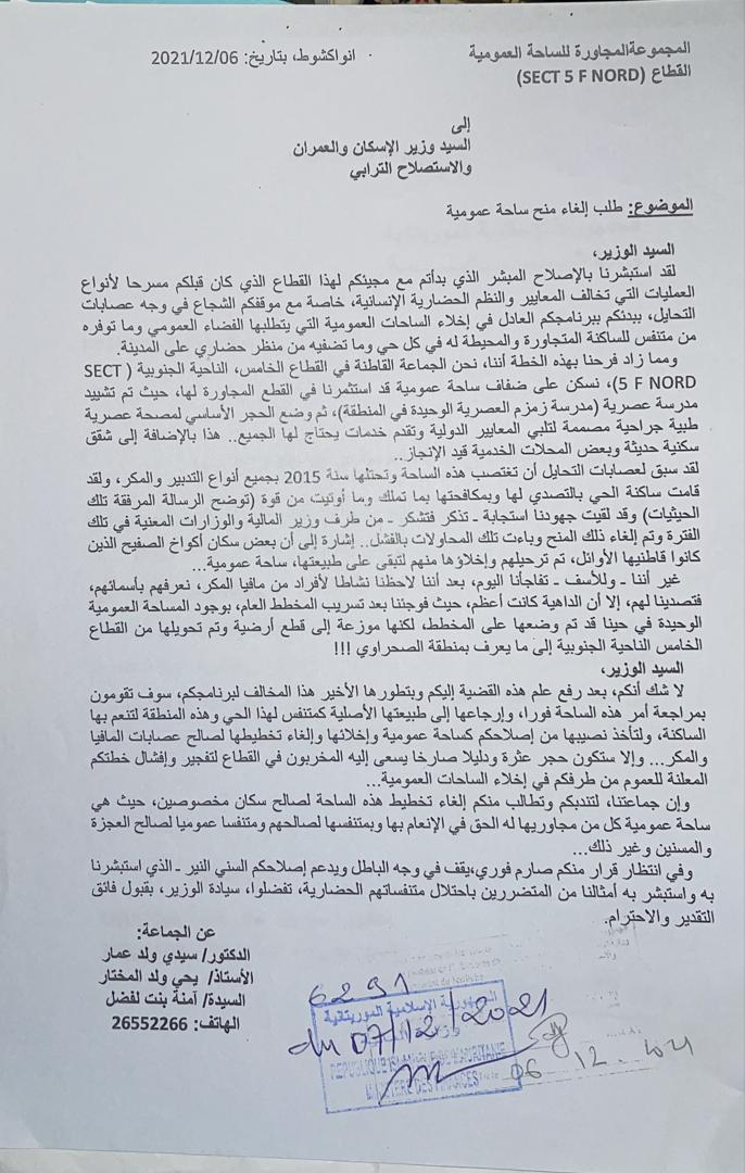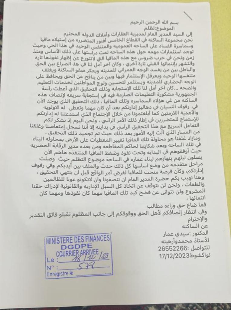 يطيب لنا باسم و نيابة عن المتضررين من شعبكم بسبب ما اقدمت عليه عناصر تنشط منذ مدة في قطاع العقارات وذالك حينما أقدمت على اعادة احتلال الساحة العمومية الوحيدة في الحي بعد أن اوقفتھا السلطات قبل ولايتكم الحالية .