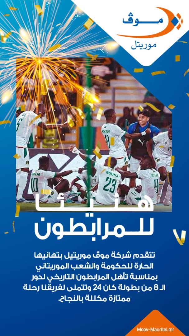 قدمت شركة “موف موريتل” تهانئها الحارة  للحكومة والشعب الموريتانيين بمناسبة فوز المنتخب الوطني (المرابطون) وتأهله للدور 8 من بطولة كان 24 ؛