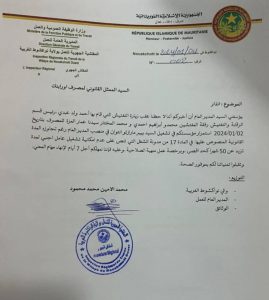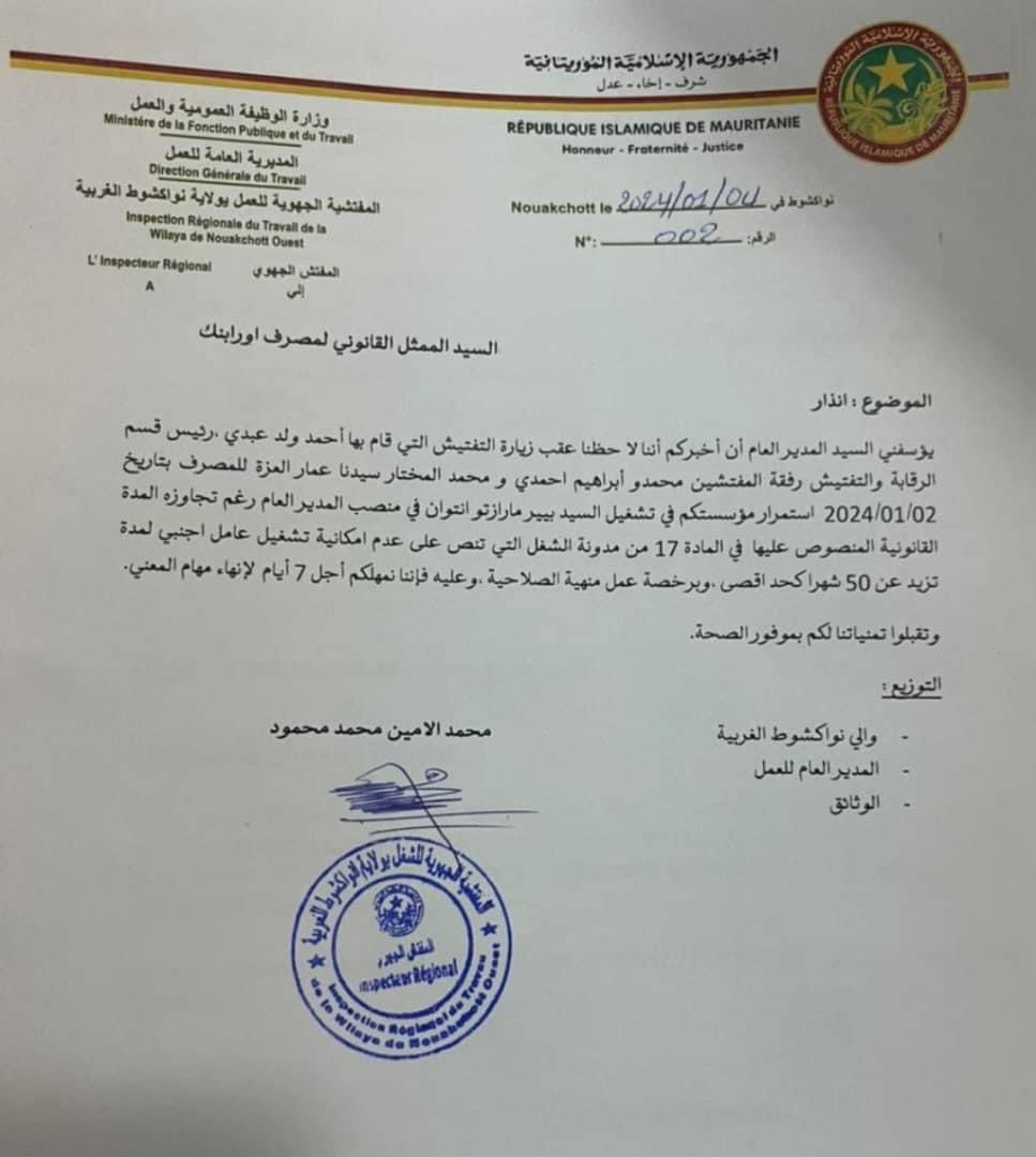 أمهلت مفتشية الشغل الجهوية في نواكشوط الغربية، مصرف أورابنك، أسبوعا لإنهاء خدمات مديره العام الايطالي بيير ماراتوز انتون، بعد تجاوز عمله في المصرف المدة القانونية المسموح بها.