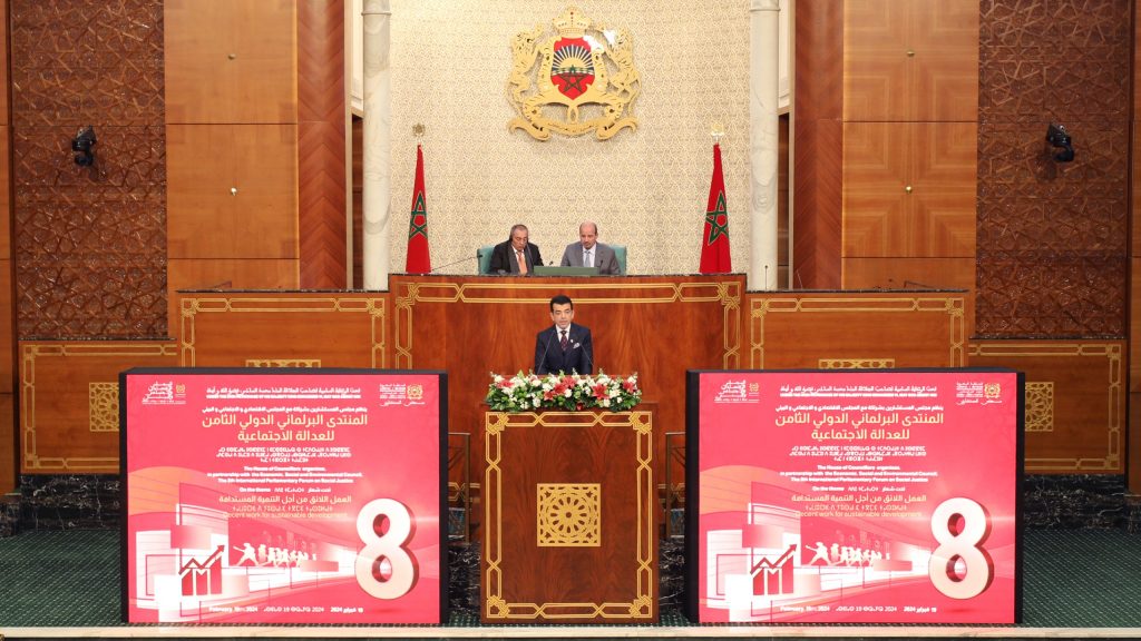 جاء ذلك في كلمته اليوم الإثنين (19 فبراير 2024) خلال الجلسة الافتتاحية للمنتدى البرلماني الدولي الثامن للعدالة الاجتماعية، الذي ينظم تحت الرعاية الملكية السامية لصاحب الجلالة الملك محمد السادس، نصره الله، ويعقده مجلس المستشارين بمقره في الرباط، بشراكة مع المجلس الاقتصادي والاجتماعي والبيئي بالمملكة المغربية، تحت شعار: “العمل اللائق من أجل التنمية المستدامة”، بمشاركة عدد من الوزراء والمسؤولين والبرلمانيين المغاربة، ومجموعة من الشخصيات الدولية رفيعة المستوى.
