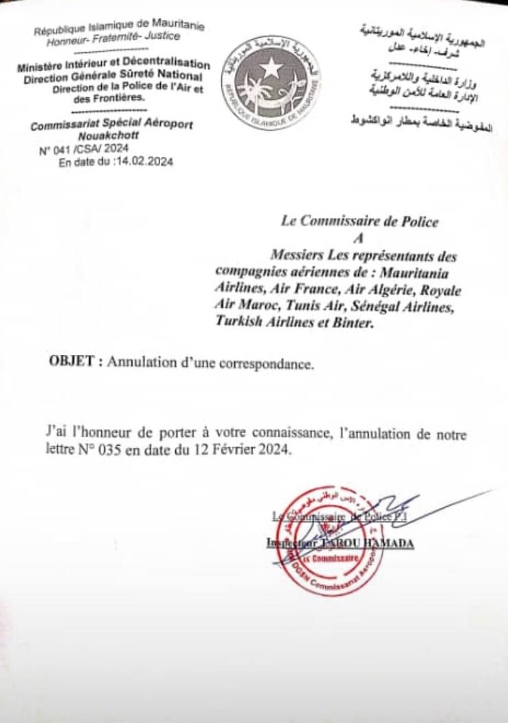 أصدر مفتش الشرطة تارو حماده مذكرة موجهة إلى ممثلي شركات الطيران العاملة في موريتانيا، بموجبها تم إلغاء المذكرة الصادرة عن المفوض السابق لمفوضية الشرطة في المطار أحمد ولد ماموني، والتي أدت لإقالته من منصبه.