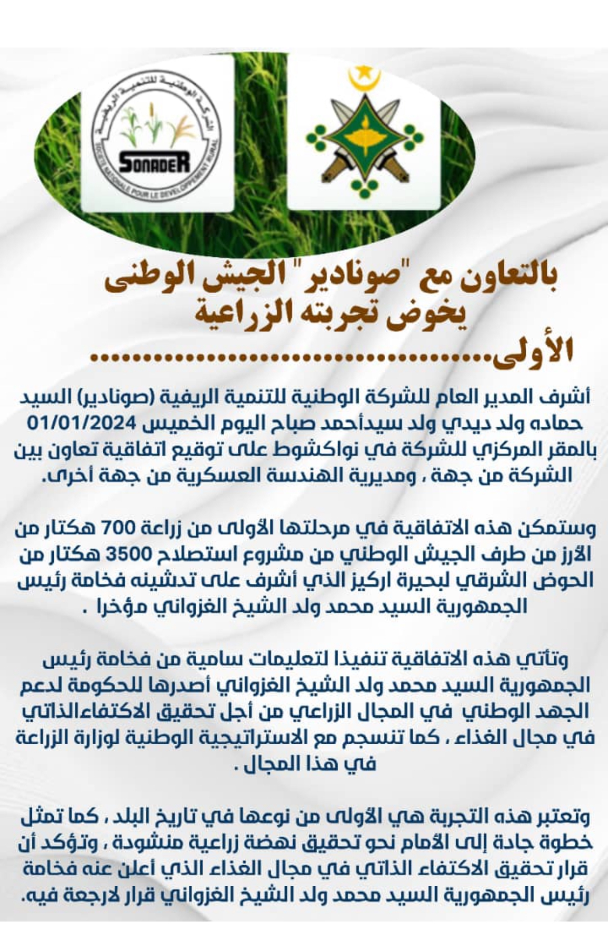 وستمكن هذه الاتفاقية في مرحلتها الأولى من زراعة 700 هكتار من الأرز من طرف الجيش الوطني من مشروع استصلاح 3500 هكتار من الحوض الشرقي لبحيرة اركيز الذي أشرف على تدشينه فخامة رئيس الجمهورية السيد محمد ولد الشيخ الغزواني مؤخرا .