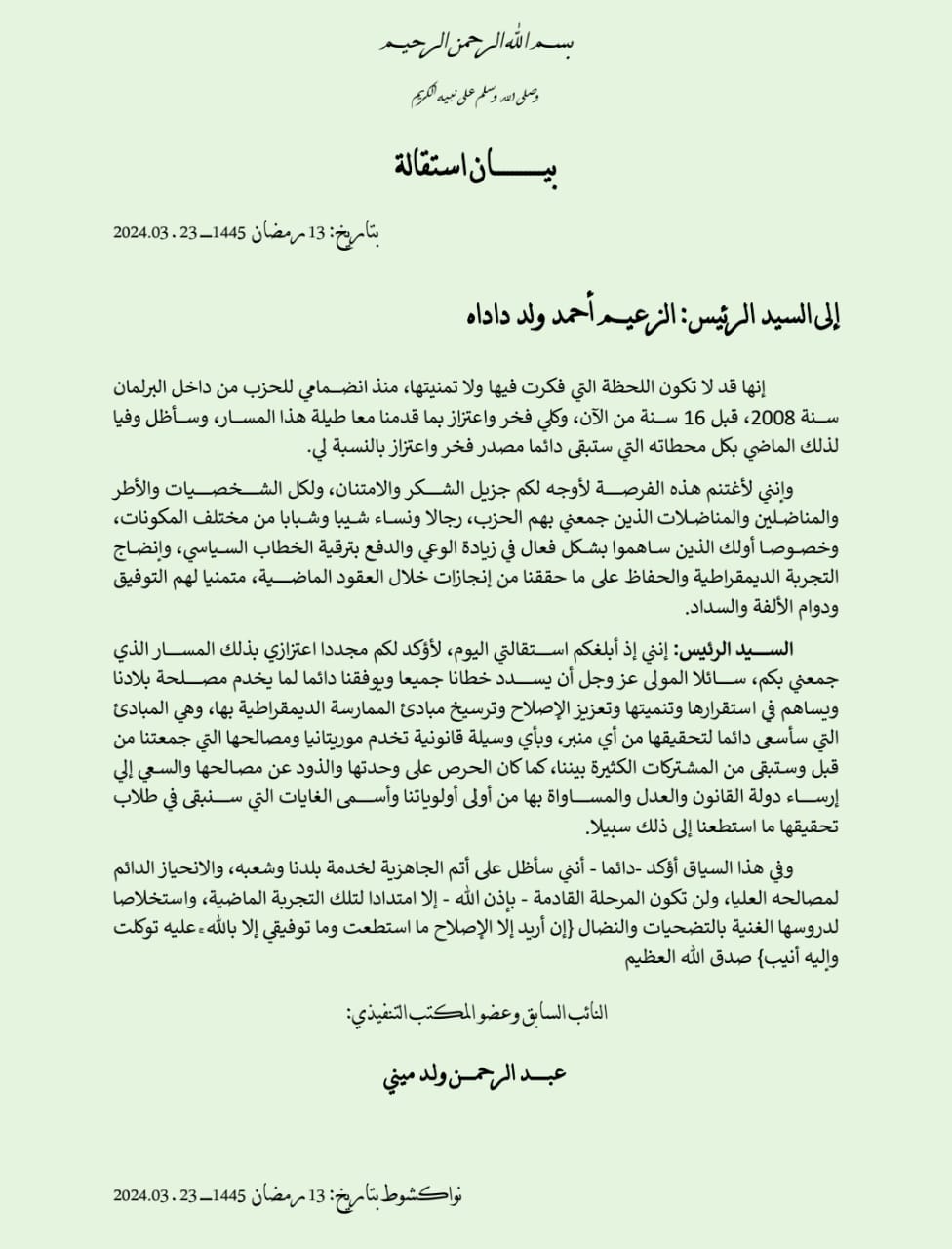 أعلن النائب السابق والقيادي بحزب تكتل القوى الديمقراطية، عبد الرحمن ولد ميني، استقالته من الحزب، اليوم السبت، وذلك عبر بيان استقالة وقعه ولد ميني موجه لرئيس الحزب.